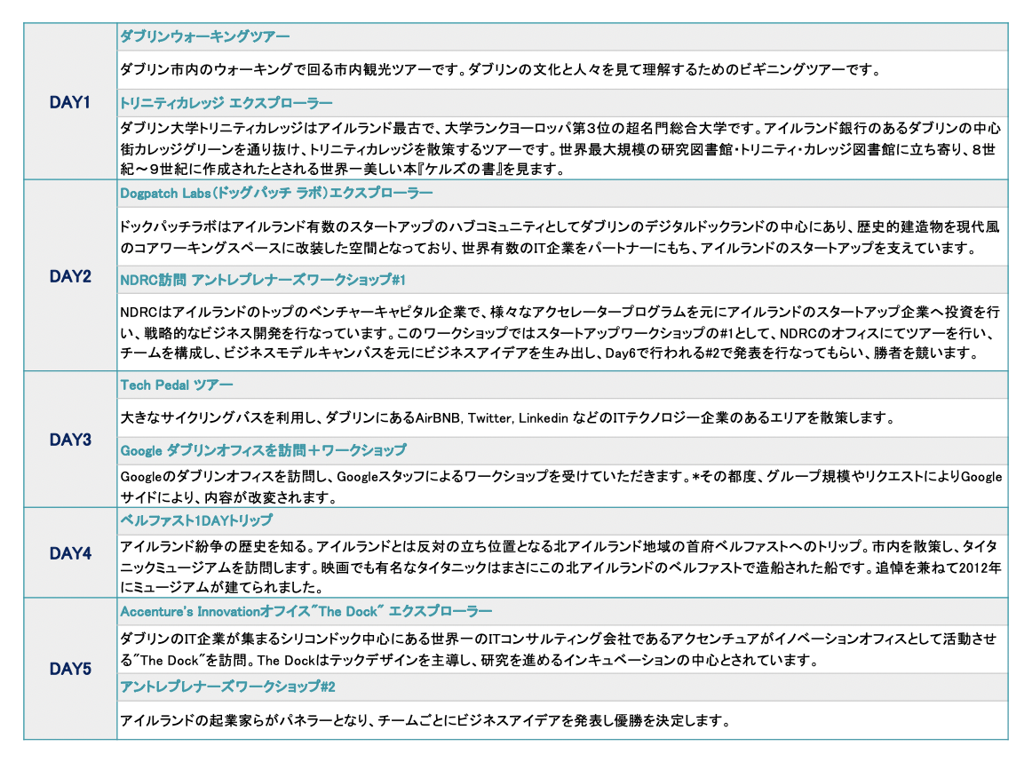 教育ソリューション アイルランドアントレプレナーズ研修旅行 アイルランド官民一体のスマートシティ計画「Platform for Innovation」シリコン・ドック。有名ITテック企業と起業家によるアントレプレナーズ研修。 アイルランドの国土面積はほぼ北海道と同じくらいで約500万人が住む小さな国です。今そのアイルランドのダブリンのグランドカナルにGoogleをはじめ、Facebook, Accenture, Twitter, AirbnbなどのITテック企業が欧州の基盤事業として進出をしています。その地区は”シリコンドック”と呼ばれ、もともとスタートアップが盛んだったアイルランドの起業家とのハブコミュニティともなっています。 政府レベルでは、経済インセンティブプログラムとして、アイルランド国内での起業支援を行い、スタートアップを支援するイキュベーターヤアクセラレーターの企業も積極的に受け入れをしています。官民が一体となり、スマートシティ計画でアイルランドの国力の増大へ取り組んでいます。 アイルランドの団体研修では当社のマルタオフィスが基軸となり、アントレプレナーズスタディツアーを企画、運営しております。他にはない、現代テクノロジーの最先端を行く企業とスタートアップ企業の結びつきがある環境は他国では体験できません。NDRCというアクセラレーター企業との提携で大手テック企業やスタートアップ企業、ハブコミュニティでの交流や見学、ワークショップなどを実現できるまさにオンリーワンのプログラムです。 サンプルスケジュール(1週間) アイルランドアントレプレナーズ研修旅行に関する資料請求・お問い合わせは下記よりお問い合わせください。 アントレプレナーズ研修旅行のお問い合わせはこちら