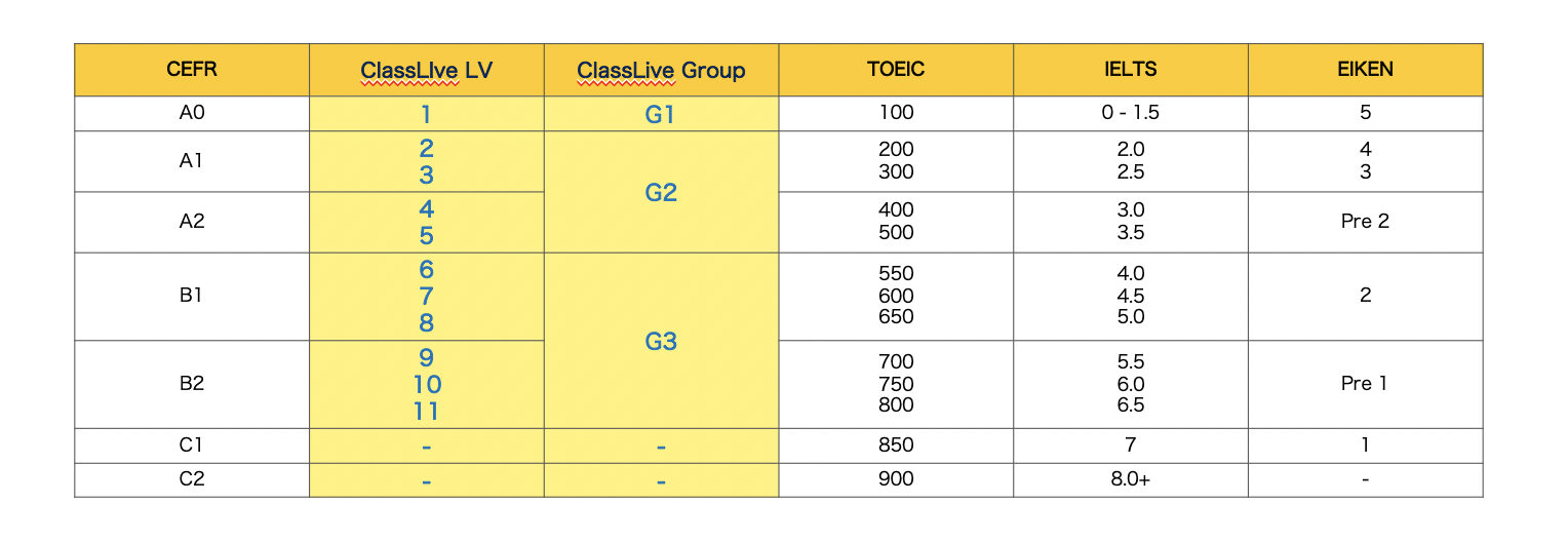 ClassLiveのレベルスケールは11段階で構成されており、CEFR「外国語の学習・教授・評価のためのヨーロッパ言語共通参照枠(Common European Framework of Reference for Languages: Learning, teaching, assessment)」に準拠したレベルにて判定が可能です。