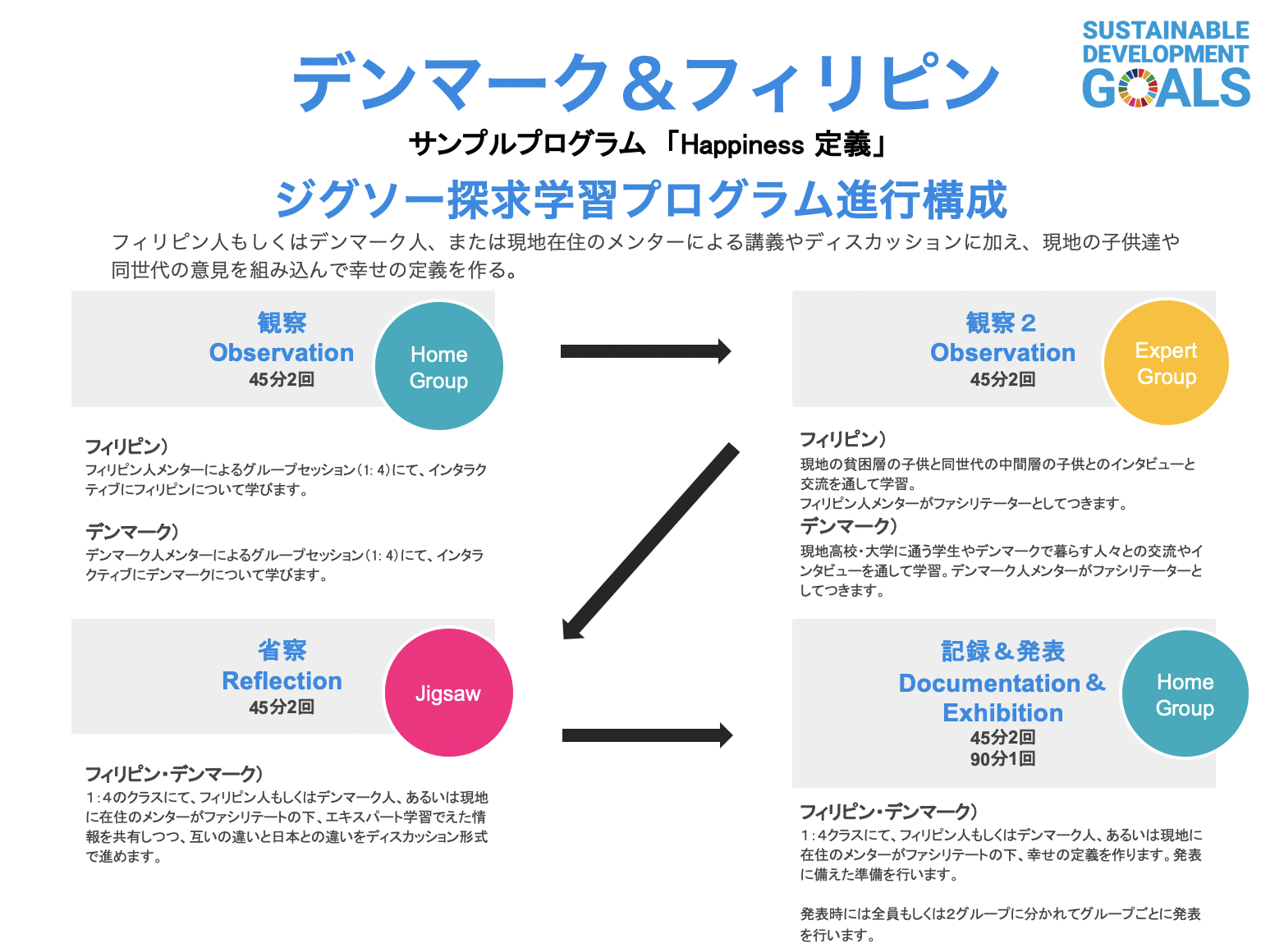 日本と異なるバックグラウンドを持つ2つの国(フィリピンとデンマーク)とオンラインで繋ぎ、それぞれのバックグラウンドを学ぶ講義に加え、現地の人々へのインタビューを通して、「幸せの基準」について考えます。自分のこと、また日本のことを客観的に知る機会を作ります。